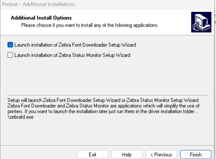 - Click Next. Keep the checkbox "Launch installation of Zebra Font Downloader Setup Wizzard" ticked to install fonts.