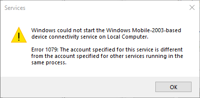 If an error occurs indicating Windows could not start the Window Mobile-2003-based device connectivity service on the Local Computer, error sample: