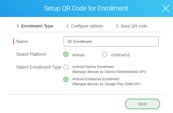 - Type in the Name and ensure the Select Platform is set to Android and Select Enrollment type is set to Android Enterprise Enrollment. Click Next.